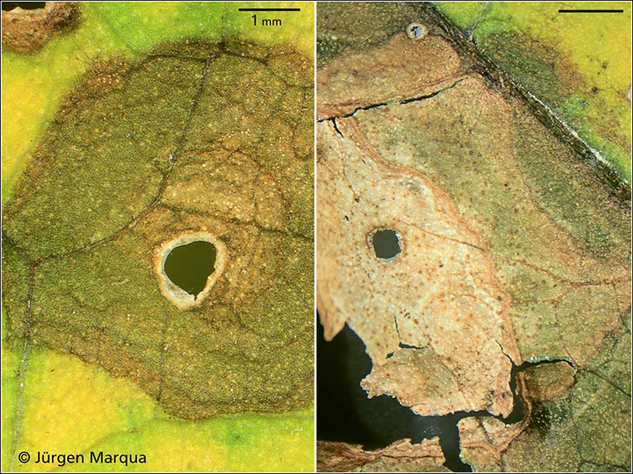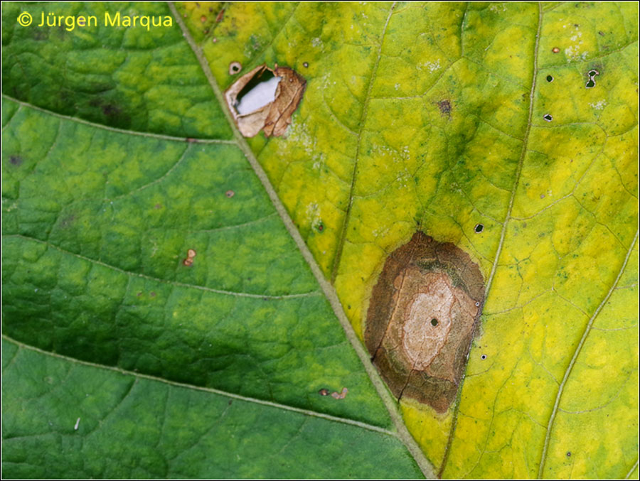 Befallsbild: Zuerst vereinzelte, rundliche Blattflecken, die sich später zu größeren nekrotischen Flächen entwickeln und von Blattadern begrenzt, eckig aussehen knnen. Flecken braun bis hellbraun, stets mit hellerer, pergamentartiger Mitte und konzentrisch, mit dunkelbraunem Randbereich. Pyknidien oliv- bis hellbraun und gleichmäßig im Zentrum der Flecken verteilt. Befallene Blätter verfärben sich gelblich.
