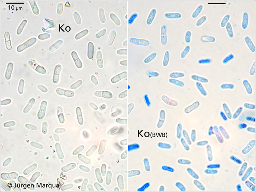 Konidien [95% • 35 • SAP • v • H2O(nat)]: 8,5-10,7-13(13,1) x 2,9-3,6-4,4 µm; Q = 2,2-3,0-3,8; Vm = 75 µm³; langellipsoid – zylindrisch, jung 1-zellig, reif 2-zellig, reife Konidien an den Septen etwas eingeschnürt, hyalin, glatt.
