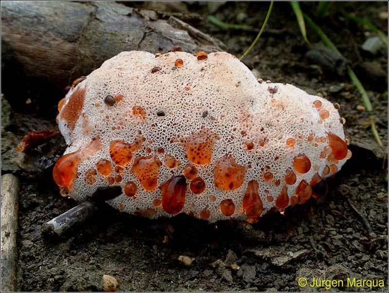 Hüte dünnfleischig, überlappend. Oberfläche rauh behaart, mit rötl. Tropfen, alt bräunlich. Kontext