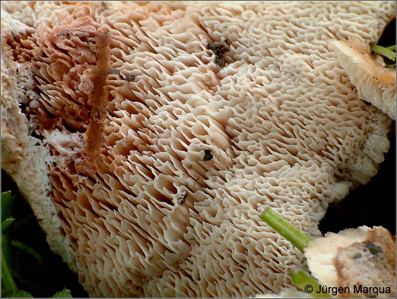 – 5mm dick. Stiel bis 7×3 cm, zentral bis lateral. Poren frisch weiß, auf Druck rötend, eckig od.