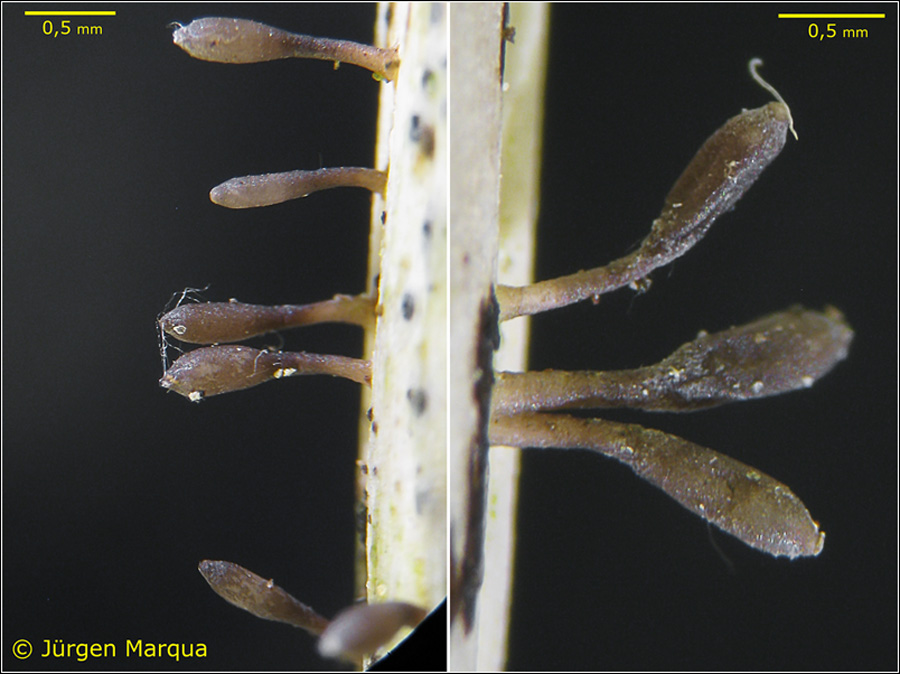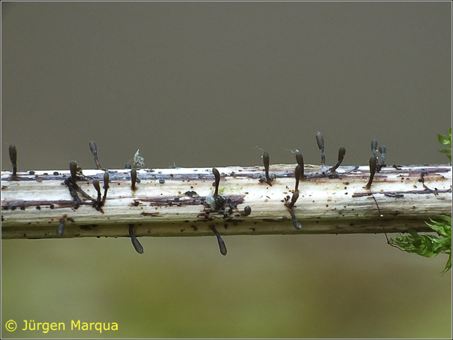Fruchtkörper 2-4 mm hoch, aus zylindrischem Stielchen und keulig bis lanzettlich geformtem und leicht abgeplattetem Kopfteil bestehend, jung olivgelblich – grünlich, älter olivbräunlich bis schwärzlich (Anthrazit), Oberfläche matt samtig, gesellig bis teilweise am Fuß büschelig verwachsene Exemplare. Im Querschnitt zeigt sich ein weißlicher Inhalt, teilweise sind die Frk. auch etwas hohl! Geschmack und Geruch nich getestet, auch nicht die Sporenpulverfarbe. Konsistenz weich bis gummiartig, aber auch etwas zäh.