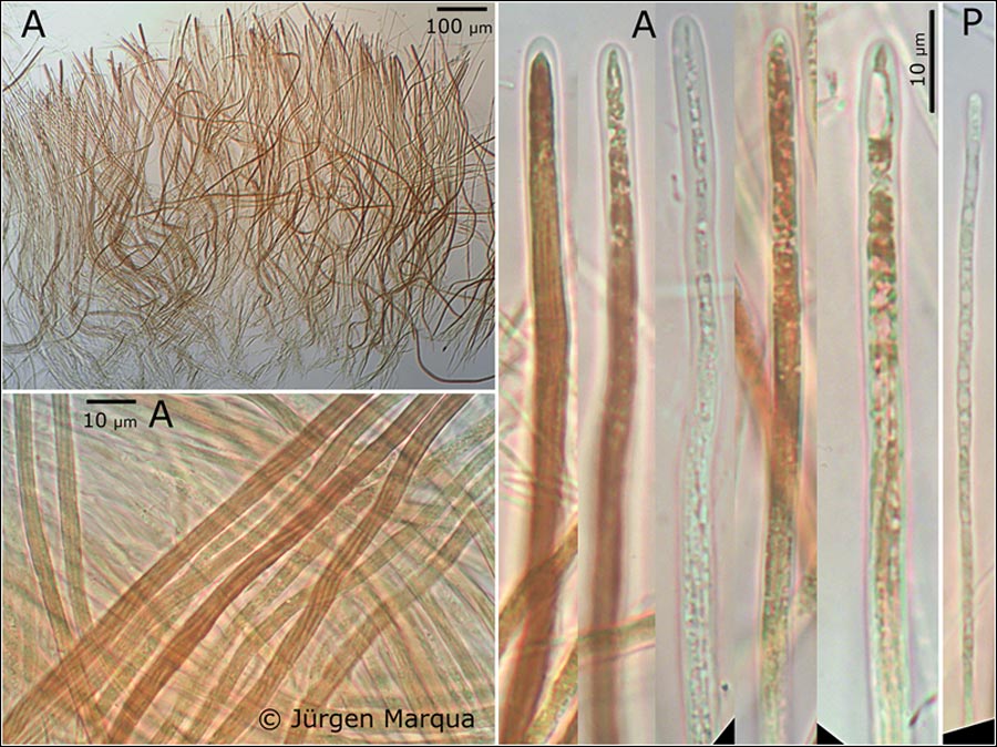 Sporen [lt. Literatur]: 340-400 x 2-3 µm; filiorm, mehrfach septiert, hyalin, glatt, vereinzelt mit Öltröpfchen. Asci – 450 µm lang, filiform, octoseriat, apikal mit porusartiger Struktur?, J-. Pseudoparaphysen gesehen; filiform, zylindrisch, kaum septiert, hyalin.