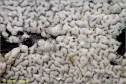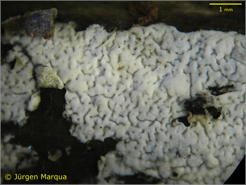 sehr gut vom Substrat abzieh- und abschiebbar. Hymenium nicht entwickelt, matt und feinfilzig, unter der Lupe deutlich meruloide Struktur, kaum entwickeltes Subikulum.