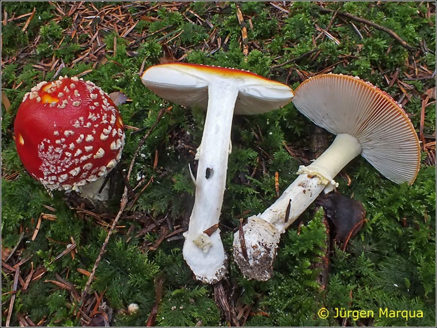 unterscheidet sich nur durch die bräunlichen Farbtöne der Huthaut und den eher flockigen (nicht warzigen) Velumresten an der Stielbasis.