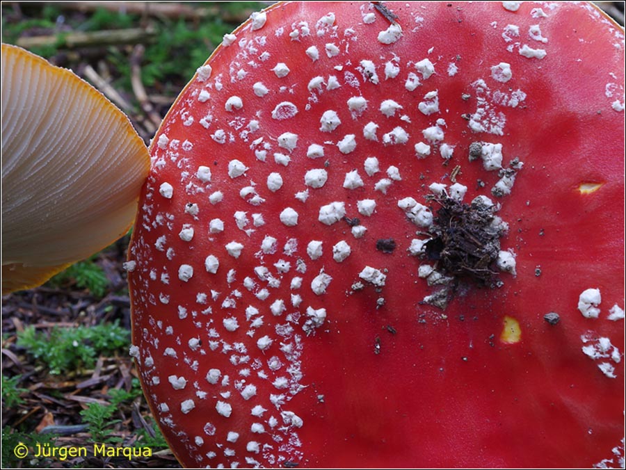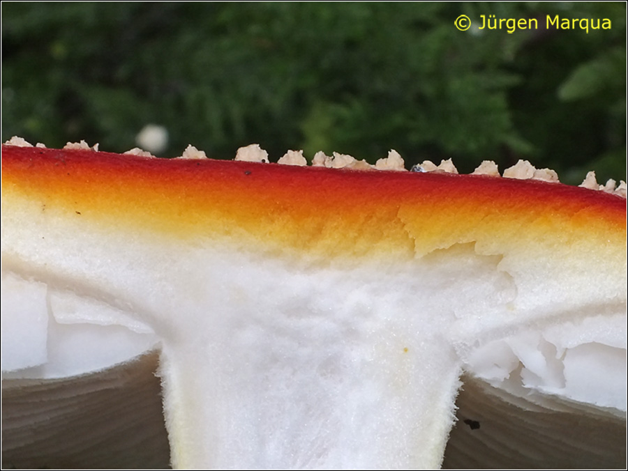 Hut bis 150 mm breit, jung kugelig – halbkugelig, älter flach ausgebreitet, ohne Buckel, Huthaut signalrot und glatt mit aufgelagerten, warzigen Flocken (Velumresten),