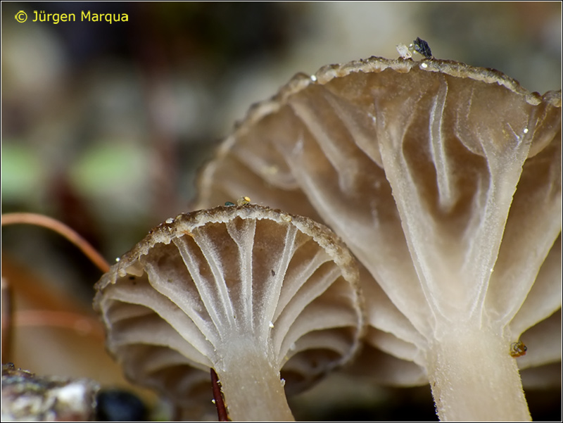 und in der Nähe des Hutrandes gabelnd. Stiel 10-15 x 2-3 mm, zylindrisch, basal etwas vedickt, auf ganzer Länge fein bereift (nur mit Lupe sichtbar),