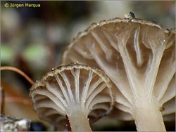 Hut 5-10 mm breit, konvex, auch leicht trichterförmig mit eingesunkener Hutmitte, stark gerieft mit gebördeltem Hutrand, hygrophan, durchscheinend
