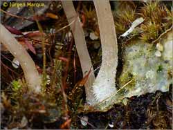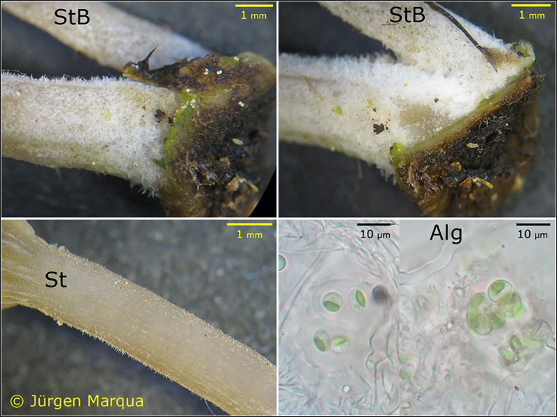 basal weißlich striegelig und in Flechtenthallus (Gattung Peltigera) übergehend; im Querschnitt ein grüner Übergangsbereich zwischen