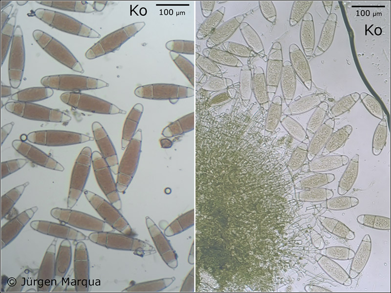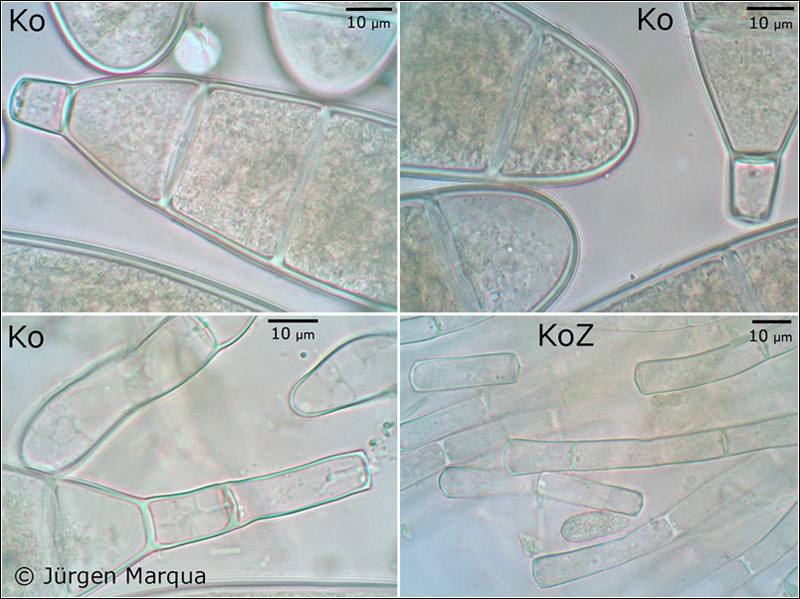 Konidien: 120-180(200) x 35-40 µm; spindelig, apikal breit abgerundet, basal mit kleinem Stielchen, 4-5fach septiert, in den septierten Fächern hellbraun – gelblich pigmentiert, apikales Fach hyalin, basal mit kleinen hyalinen Stielchen, die den konidiogenen hyalinen und rel. dickwandigen Hyphen entspringend. Konidiogene Zellen und Hyphen mit einfachen Septen ohne Haken oder Schnallen.