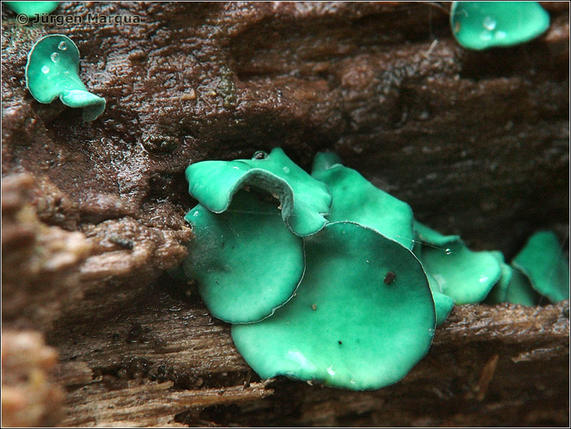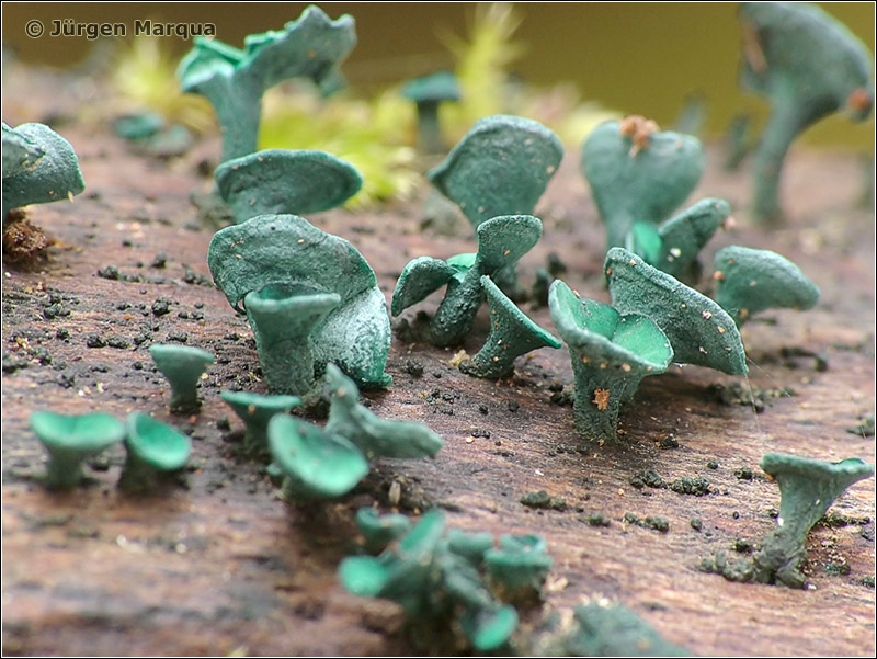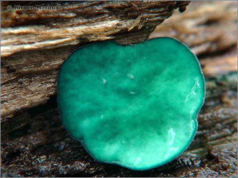 Fruchtkörper becher- bis pokalförmig, älter auch flach ausgebreitet und an den Rändern verbogen, 2-10 mm Ø, blaugrün.