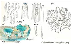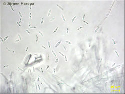 Sporen: 6-10 x 1,5-2 µm; spindelförmig, glatt, hyalin, mit Tropfen. Paraphysen filiform, apikal leicht keulig.