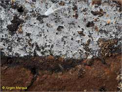Kolonie als samtiger, haariger brauner bis schwarzbrauner Belag (meistens auf Holz – hier auf einem Rindenpulz).