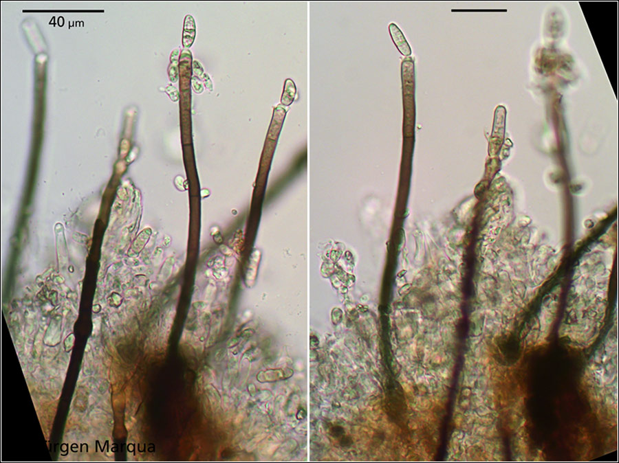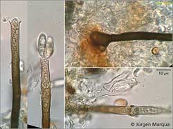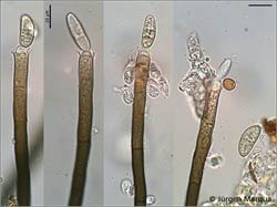 Die Konidien befinden meist in einer schleimigen Masse und hängen am Konidienträger. Konidienträger bis 300 µm lang, unverzweigt, dunkelbraun, septiert, apikal mit einer