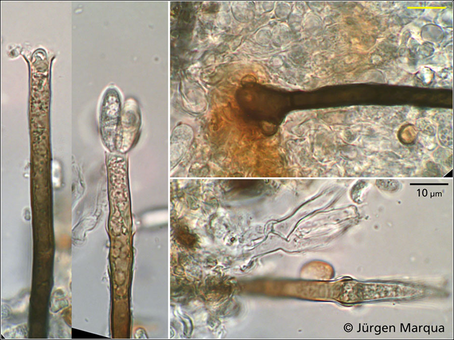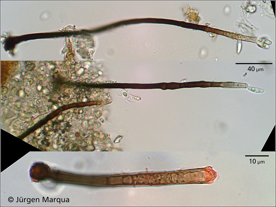 art Kollar, aus dem sich die Konidien schieben, apikal etwas heller, basal mit keulig verdickter “Wurzel”.