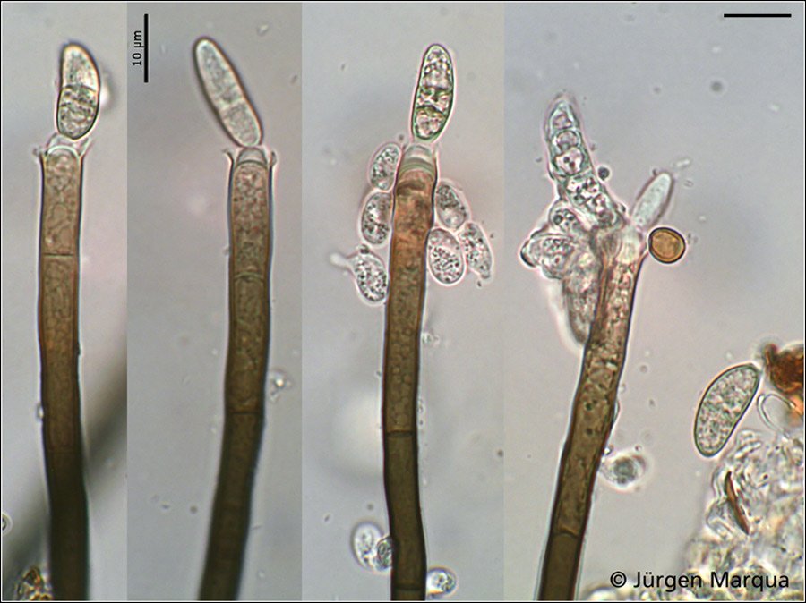 Konidien 15-22 x 4,5-5 µm; ellipsoid bis allantoid, jung hyalin mit großen Guttulen, älter dickwandiger und bräunlich, dann mit 3 Septen und blasseren Endzellen.