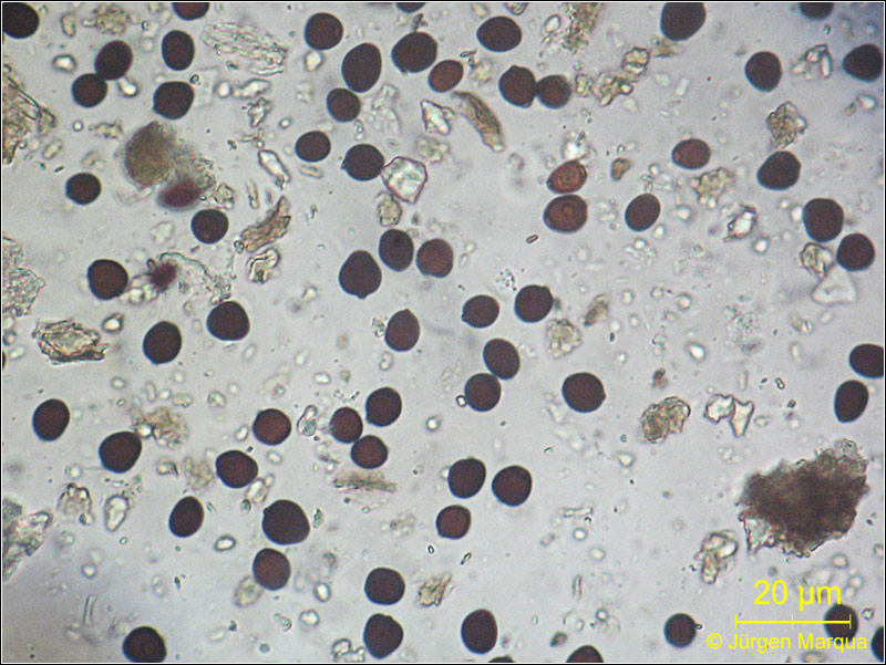 Sporen [95% • 7 • SAP • v • H2O(nat)]: 6,4-7,5-8,6 x 4,7-5,7-6,6 µm; Q = 1,1-1,3-1,5; Vm = 128 µm³; breit ellipsoid, in Aufsicht linsenförmig – leicht mitriform, dickwandig, dunkelbraun mit sichtbarem, zentralem Keimporus.