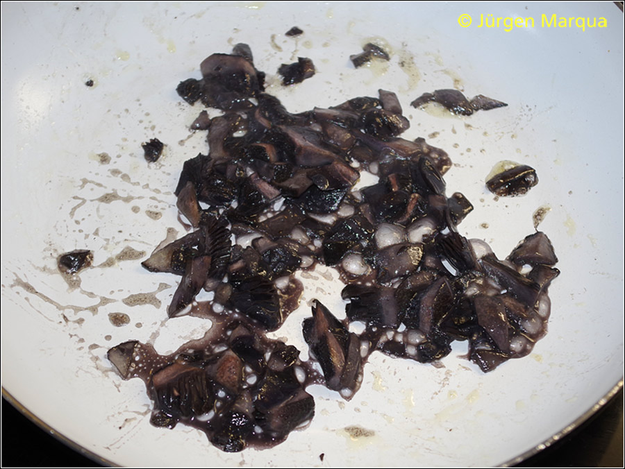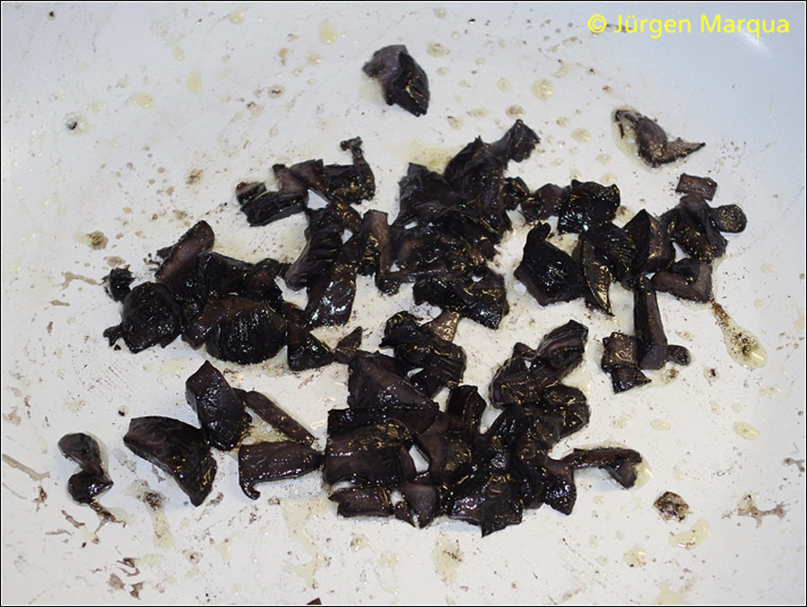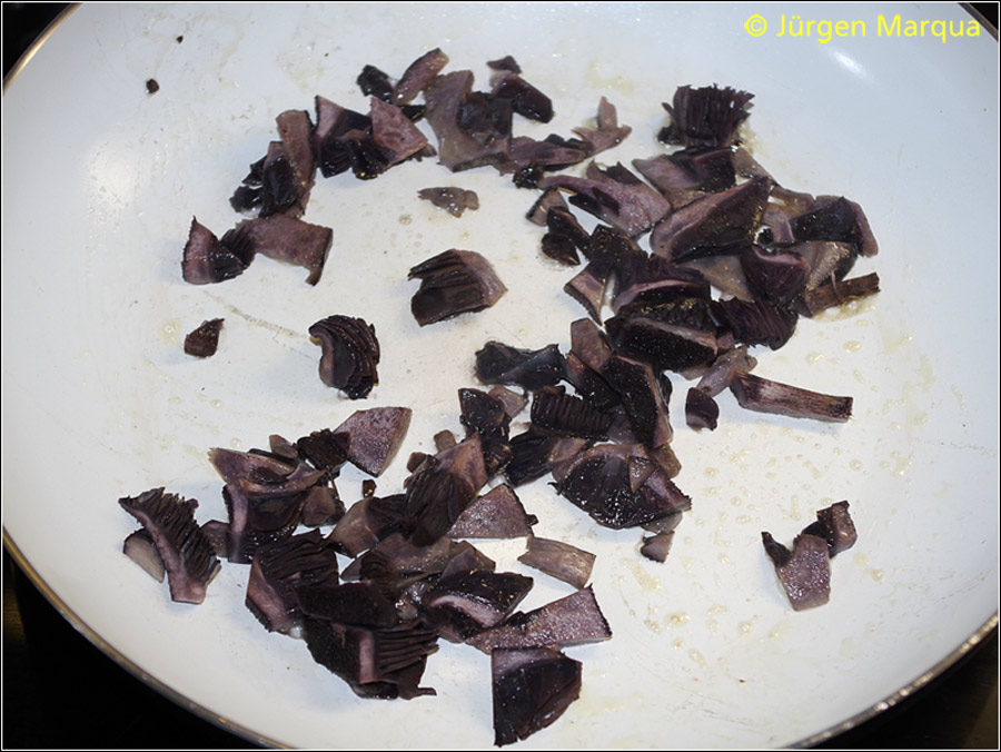 Der Schmorsaft verfärbt sich dunkelviolett bis grau oder anthrazit. Nach längerem Schmoren ein aufdringlicher chemischer Geruch wie angebrannte Autoreifen. Dieser Geruch vergeht kaum und