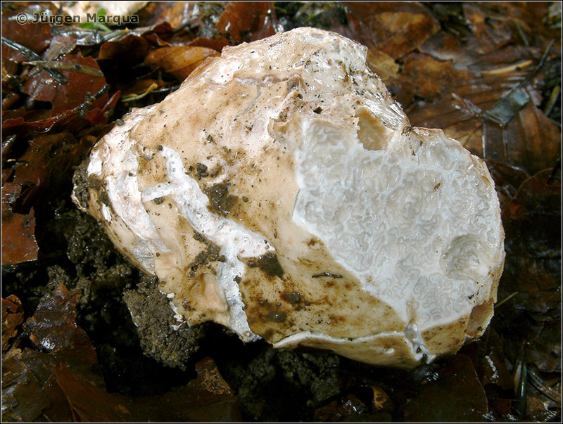 Fruchtkörper unregelmäßig knollig, kartoffelförmig, 6-12 cm Ø, schmutzig-weißlich bis blassocker,