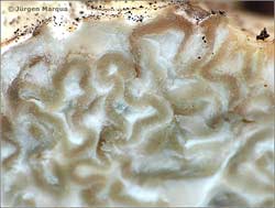 gelegentlich mit fleischrosa Schimmer. Fleisch weiß, von mäandernden Adern durchzogen, beim