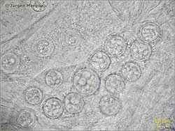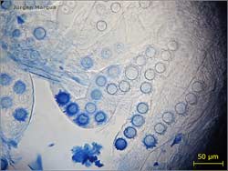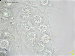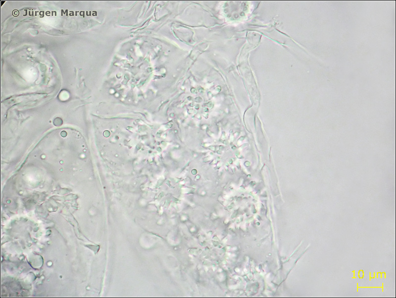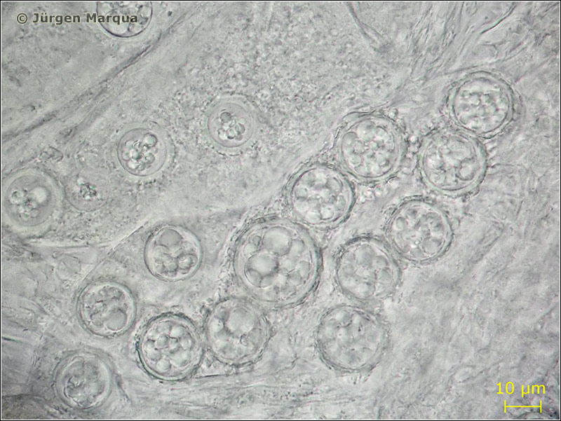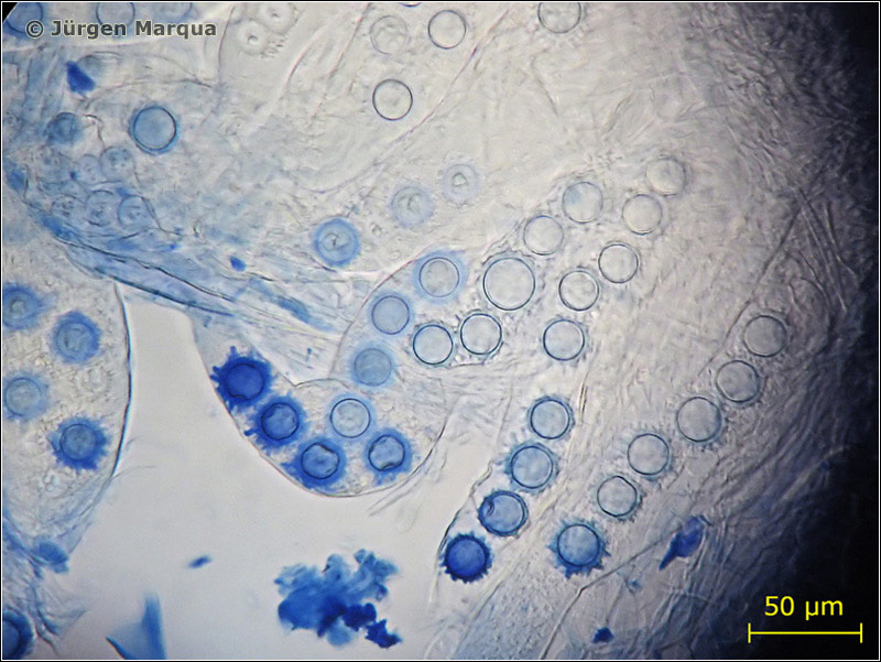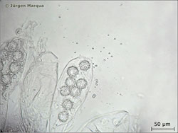 Sporen Ø – 20 µm; kugelig mit abgestutzten langen Warzen ornamentiert. Asci breitkeulig, 8-sporig.