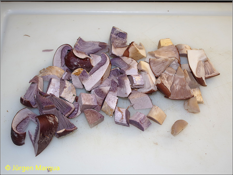 Geschmack deutlich süßlich, bissfest. nach 5 Minuten kräftige Bräunungsreaktion, lila Farbton beständig, dunkelt etwas nach.