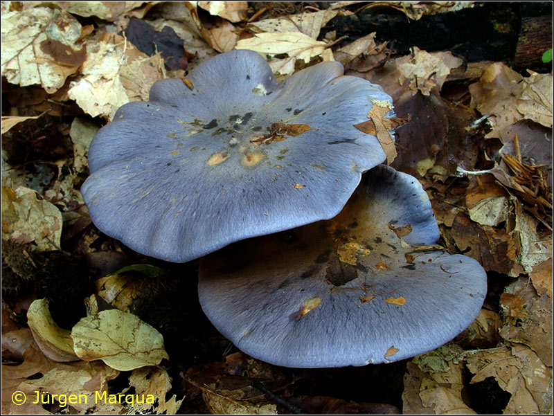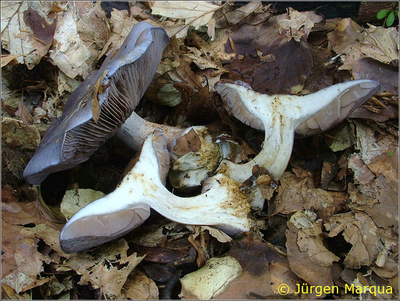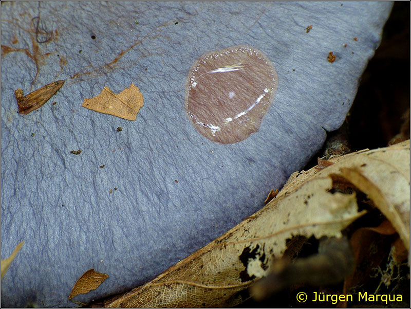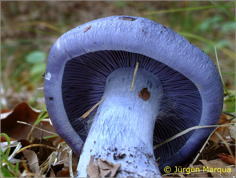 Hut – 140 mm breit, intensiv blauviolett, kaum ausblassend, dunkler eingewachsen faserig, Mitte mit schorfigen Velumresten. Lamellen grauviolett, lange so bleibend. Stiel gerandet knollig, – 30 mm breit, violett, vom Velum weißseidig überfasert, graugelblich verfärbend (vergilbend). Trama weißlich, im oberen Stielbereich violett marmoriert, mit KOH gelblich reagierend!. Geruch malzartig (Ovomaltine), eher unangenehm.
