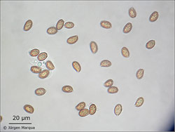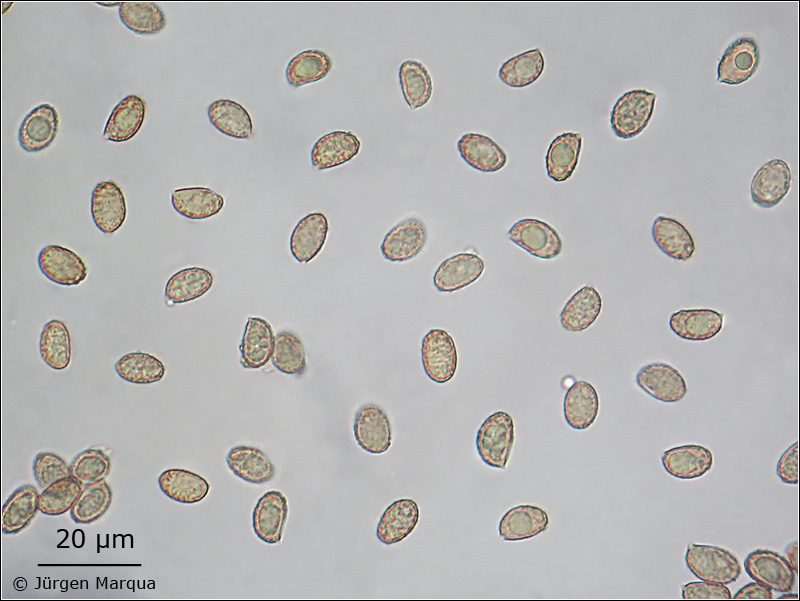 Sporen [95% • 32 • SAP • v • H2O(nat)]: 8,9-9,8-10,7 x 5,1-5,8-6,4(6,6) µm; Q = 1,5-1,7-1,9; Vm = 173 µm³; breit ellipsoid, warzig – stachelig!. Cheilozystiden vorhanden und verschieden ausgeformt; keulig, birnenförmig – zylindrisch.