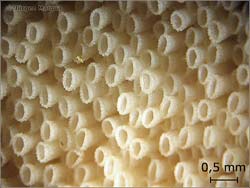 Haut. Hymenium aus kleinen, langgezogenen Becher-Röhren bestehend (cyphelloid), blassgelb,
