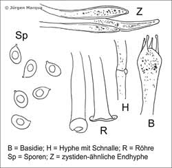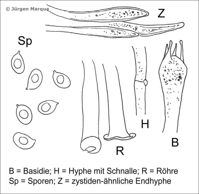 hyalin, glatt. Hyphen–Enden der Röhrenmündungen lanzettlich, länglich, hyalin, Septen mit