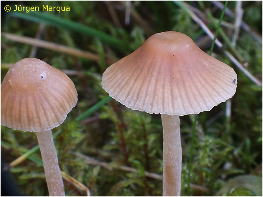 Hut 15-20 mm breit, jung glockig, älter kegelig – konvex mit Buckel, schon jung am Rand bis ca 2/3tel durchscheinend gestreift, orangebraun, am Rand heller – cremefarben,