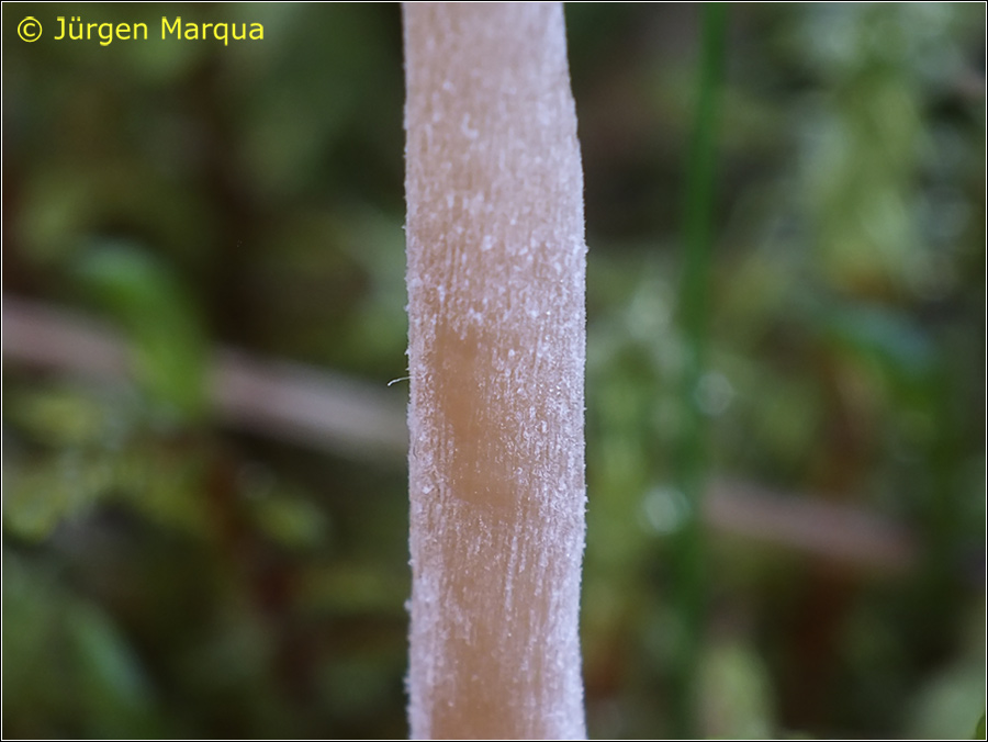 lang, filiform, oft etwas gebogen, weißlich – faserig bereift, sehr zerbrechlich. Geruch etwas mehlig – inocyboid.