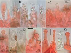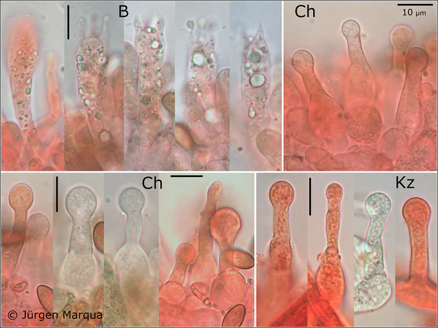 länglich ellipsoid bis subamygdaloid, braun, dickwandig, fein punktiert, ohne Plage. Basidien 4-sporig. Cheilozystiden schwach kopfig. Kaulozystiden reichlich über die