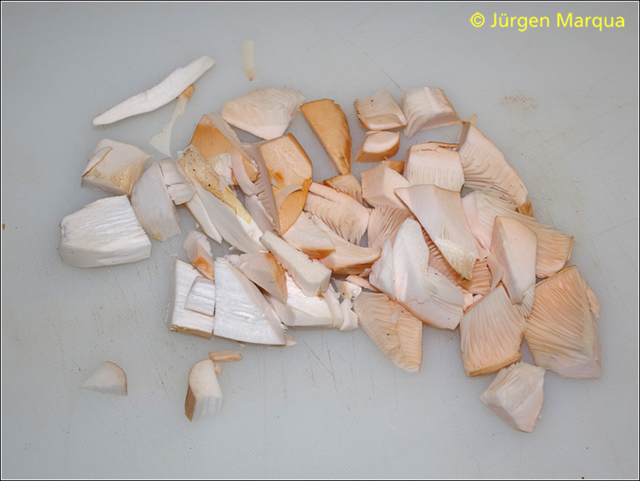 Roh festfleisch, knackig, fast ein bisschen gummiartig. Geruch aufdringlich süßlich, seifig nach Petroleum oder Terpentin. Geschmack säuerlich, fast etwas bitterlich, süßlich und aufdringlich ranzig.