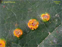 Befallsbild: Blattoberseiten mit leuchtend orangefarbenen Pusteln besetzt (Uredosporen), die anfangs kreisförmig angeordnet sind, Uredolager – 1mm Ø, etwas pustelartig aufgewölbt
