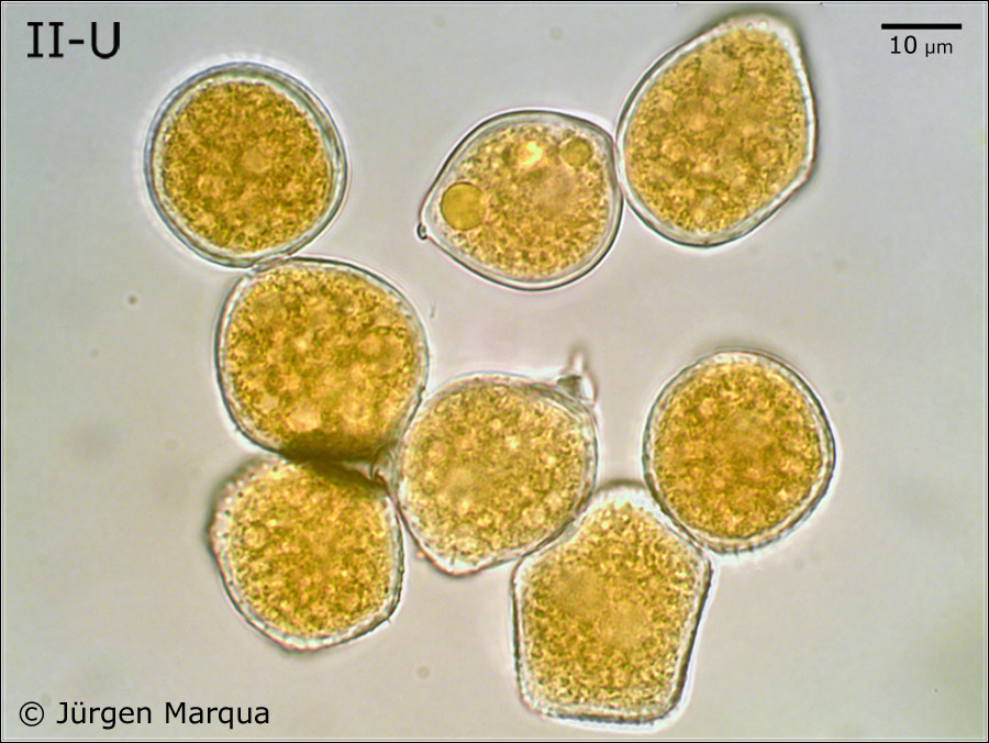 Uredosporen: 24-26 x 18-20 µm; globos, dickwandig, orangefarben mit feinstacheliger Ornamentation. Keine Paraphysen vorhanden!