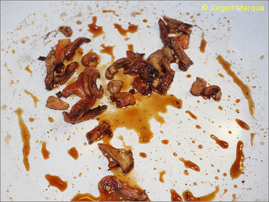 Der charakteristische Geruch bleibt im Raum, selbst, wenn die Frk. kross gebraten sind. Schmorsaft färbt sich zunächst orangebraun, später braun.