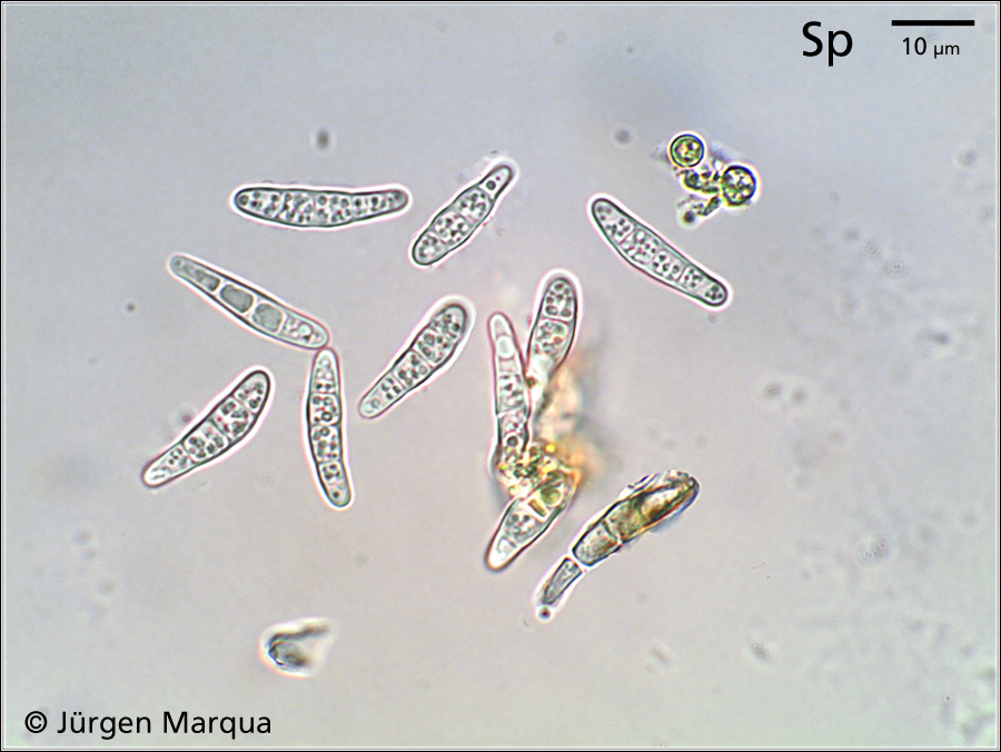 spindelig bis keulenförmig, an einem Ende mehr zugespitzt, mit 3 Septen, rel. dickwandig, jung hyalin, älter etwas bräunlich, glatt. Asci sackförmig, dickwandig. Paraphysen