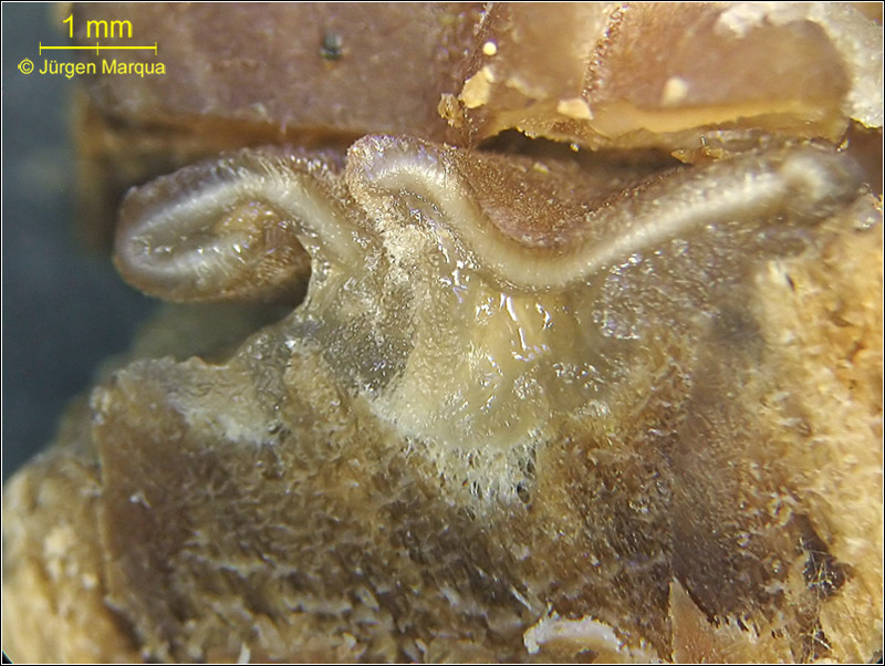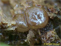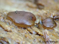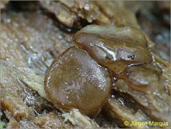 Fruchtkörper -6(7) mm Ø, kreisel- bis scheibenförmig, Frk. oft zusammengewachsen, bernsteinfarben –
