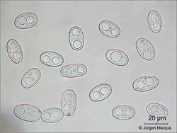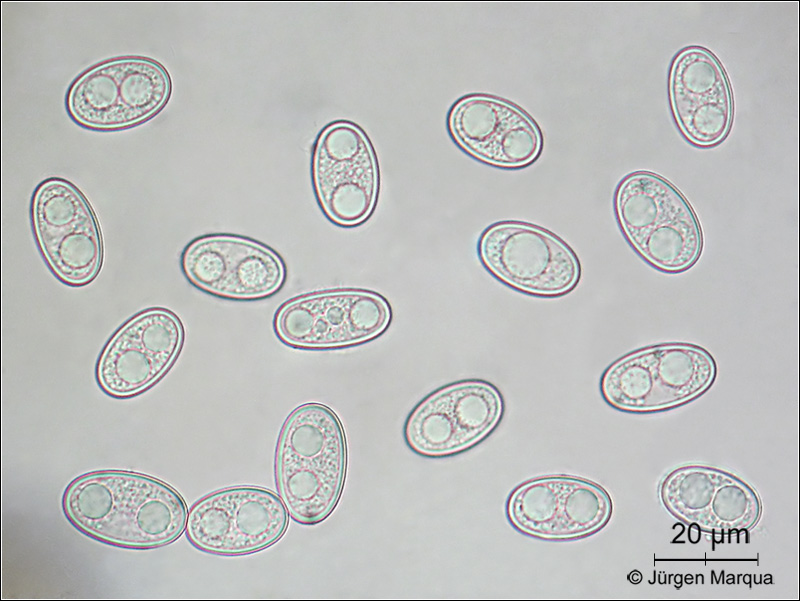 Q = 1,3-1,7-2,1; Vm = 1882 µm³; hyalin, breit-ellipsoid, dickwandig, glatt,