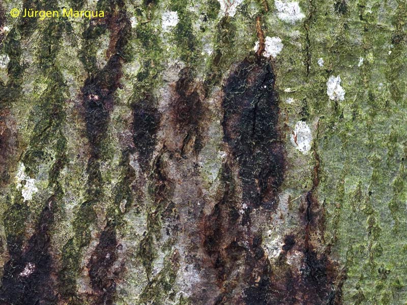 Befallsbild: schwärzliche, nekrotische und zungenförmige Flecken am Stammfuß, aus denen ein süßlich riechender und etwas klebriger Schleim fließt. Bei Anschnitt der nekrotischen Rindenbereiche ist eine rötliche Verfärbung der unteren Rindenschicht, des Kambiums und teilweise des Holzes sichtbar.