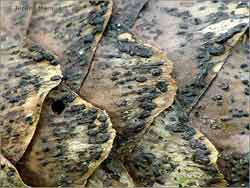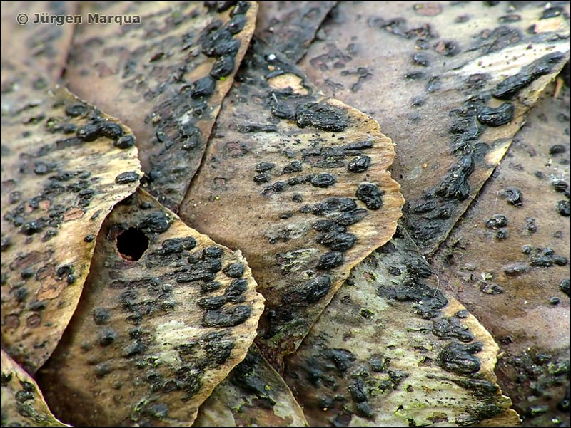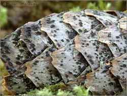 Fruchtkörper als kleine schwarze Flecken auf Fichtenschuppen bemerkbar (0,5-1 mm Ø). Ragen