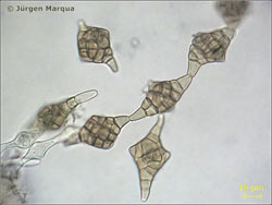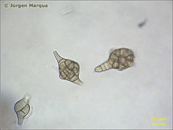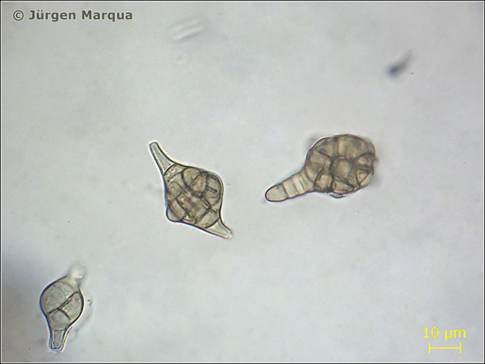 Sporen: 40-50 x 15-25 µm; spindelig, mehrzellig – fragmentiert, braun pigmentiert.