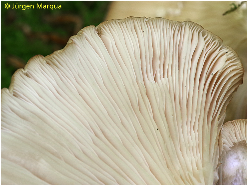 fadenförmig herablaufend, so dass er gerippt wirkt. Stiel 3-8 x 1-2 cm, schwach exzentrisch, schmutzig weißlich, kahl, mit weißfilziger Basis. Trama weiß, weich, später zäh. Geruch etwas mehlartig. Geschmack mild. Sporenpulver weißlich.