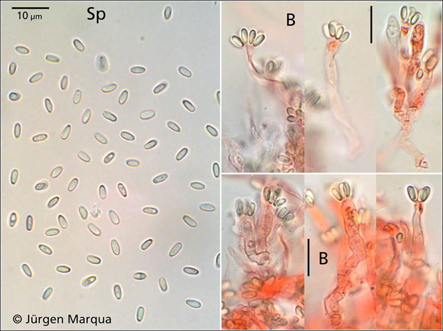 Sporen [95% • 20 • SAP • v • H2O(nat)]: 3,4-3,9-4,4 x 1,4-1,7-2,0 µm; Q = 1,9-2,3-2,7; Vm = 6 µm³; lang ellipsoid und leicht abgestutzt, glatt, blass grünlich. Basidien 8sporig, lang keulig.