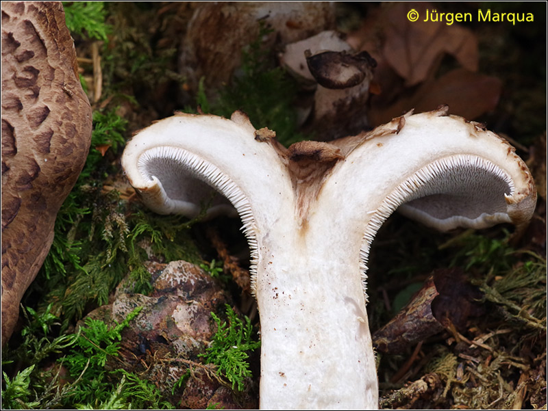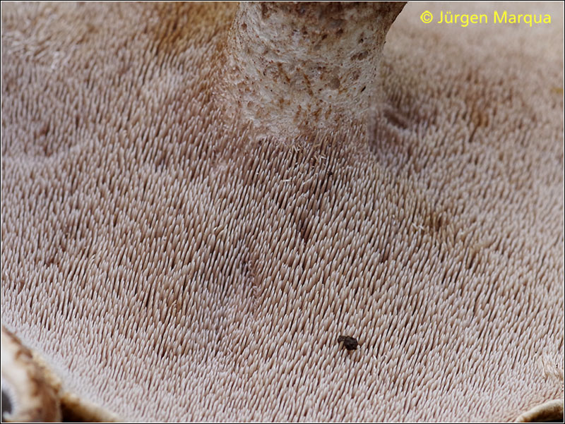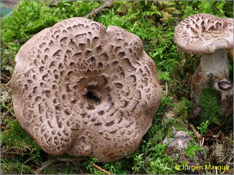 Hut flach bis trichterig (alt mir durchbohrtem Zentrum), bis 25 cm breit, Huthaut graubraun, mit großscholligen, konzentrisch angeordneten, schwärzlichen Schuppen, Hutrand jung oft herabgebogen oder fast eingekrempelt. Hymenium aus eng stehenden feinen, hellgrauen Stacheln bestehend, die