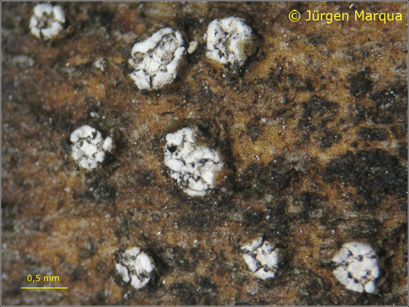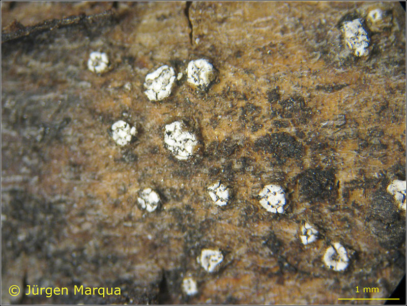 Lager der Anamorphe – 0,5 mm breit, weißliche Pusteln auf einer Art schwärzlichem Subikulum, welche das Holz durchbrechen.