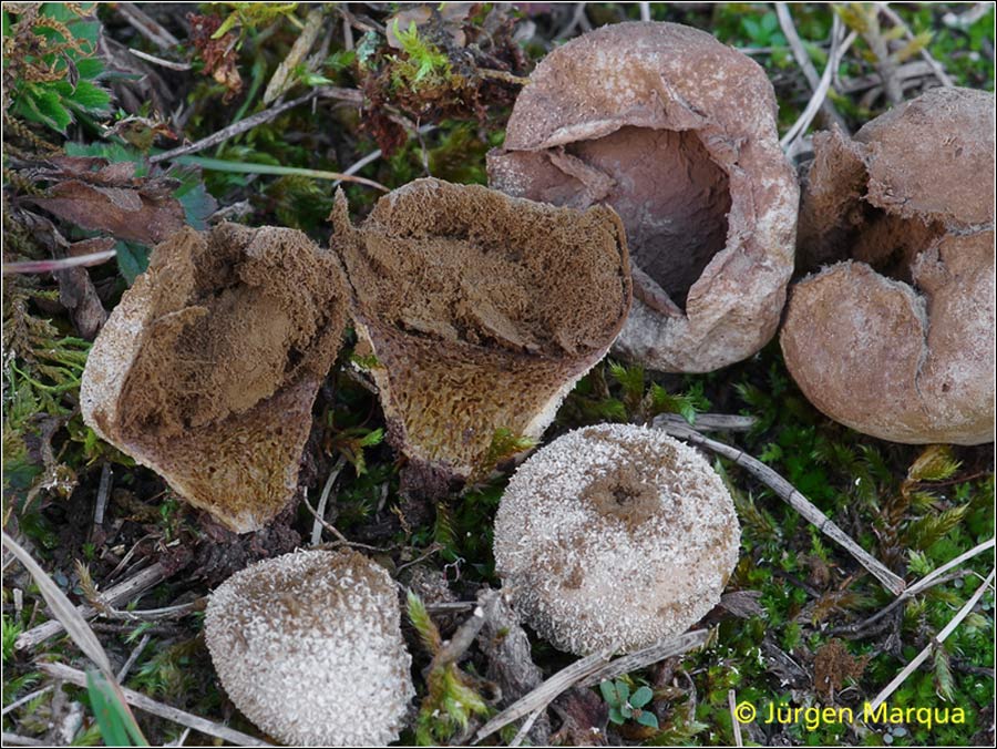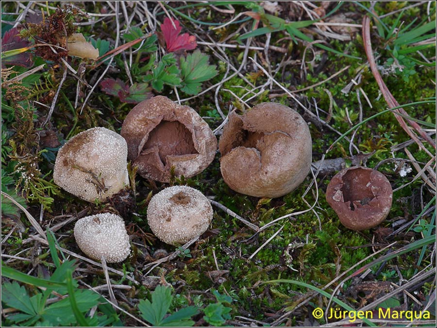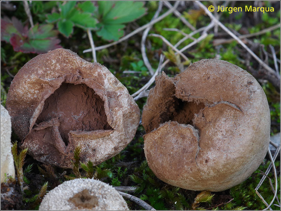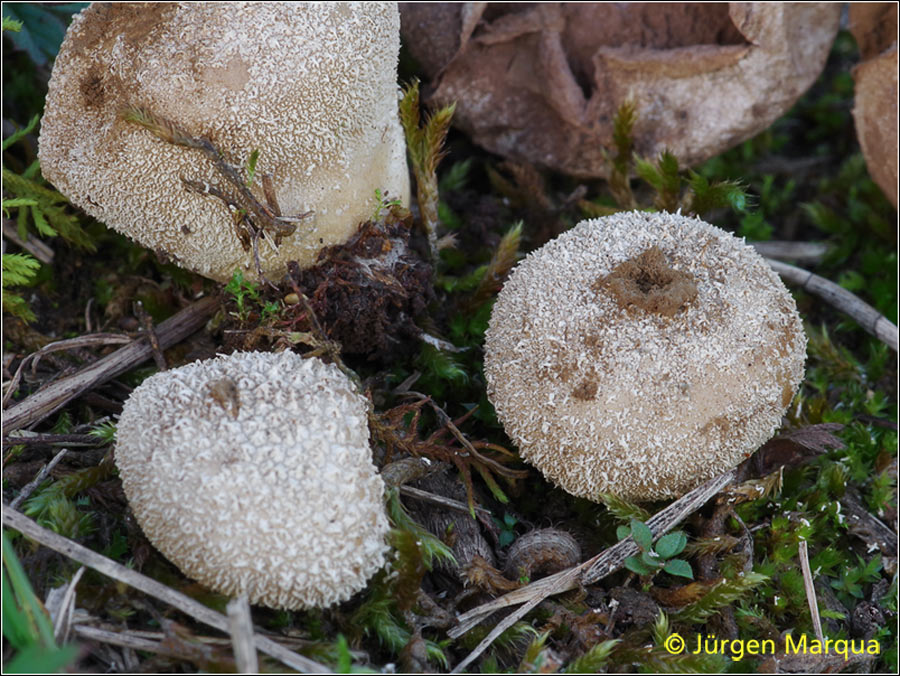 Fruchtkörper 15-40 mm im Durchmesser, jung kugelig – birnförmig, älter oft niedergedrückt, jung weiß, älter gelblich, reif olivbraun oder schmutziggrau. Exoperidie fein stachelig – körnelig. Gleba jung weiß, später olivbraun. In der Basis (Subgleba) steril und durch ein Diaphragma von der Gleba getrennt. Sporenpulver bräunlich.