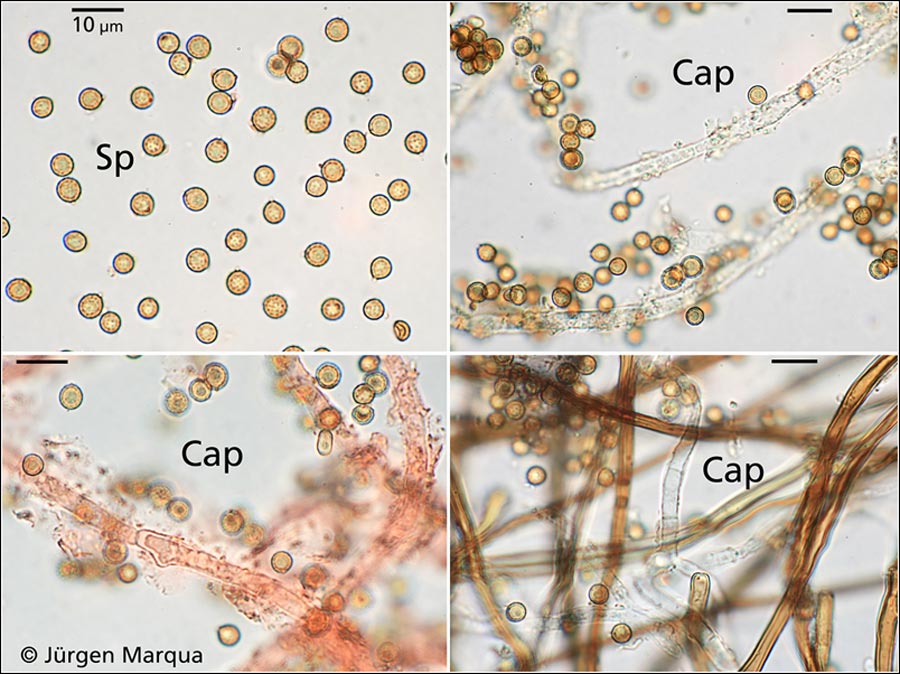 Sporen [95% • 16 • SAP • v • H2O(nat)]: 3,6-4,1-4,7 x 3,2-3,8-4,4 µm; Q = 0,9-1,1-1,3; Vm = 31 µm³; globos – subglobos, bräunlich, feinwarzig, hygrophob, mit 1-3 µm langem Sterigmenrest. Capillitium kaum vorhanden, nur in der Nähe der Endoperidienwand.
