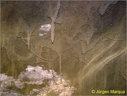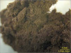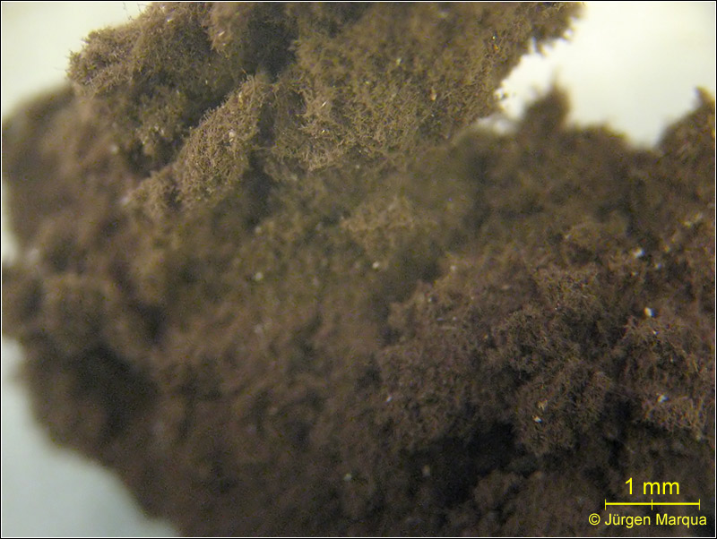 Grau- bis olivbrauner, fellartiger Überzug, der scheinbar direkt dem Stein aufwächst, und an Kellerwand und -decke großflächige Matten ausbildet.