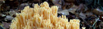 man auch bei den Leisten-, Gallert- oder Becherförmigen Pilzen suchen.